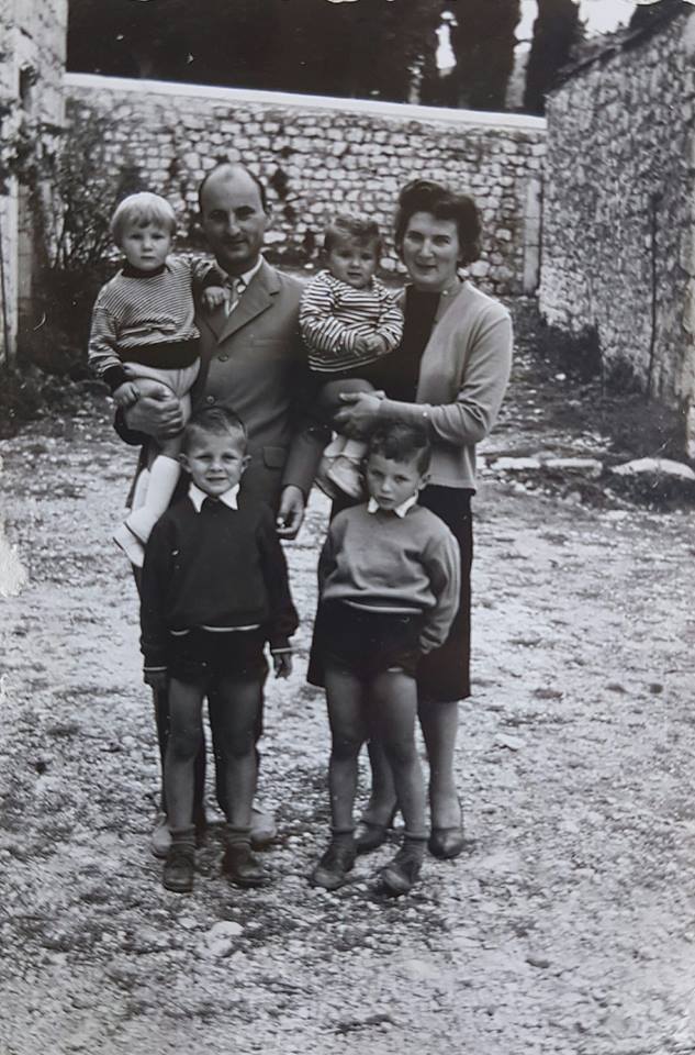 Slavko Tonković (1923.-2014.) i supruga Anka Radovinović Tonković (1926.-2012.) sa četvoro starije djece, Joškom, Jagom, Anamarijom i Milom u avliji kuće Radovinović Jagul 1959. godine.