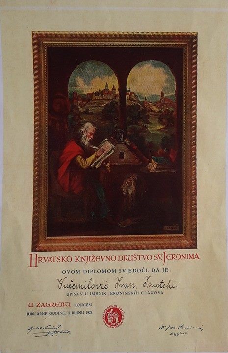 Diploma Hrvatskog književnog društva sv. Jeronima od 30. rujna 1939. godine kojom se svjedoči da je Ivan Zane Vučemilović, dugogodišnji imotski načelnik upisan u imenik jeronimskih članova, Dokument predstavlja zahvalu Ivanu Zani Vučemiloviću.